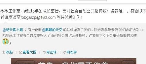 范冰冰的成功有一半是自身的努力,还有一半是因为范冰冰工作室的积极配合,每次范冰冰出席活动的时候范冰冰的工作室都会第一时间发布消息,无论是半夜还是造成,总是能看到范冰冰的一手资料,最近范冰冰的工作室首次面向社会招聘,引起很多人的关注